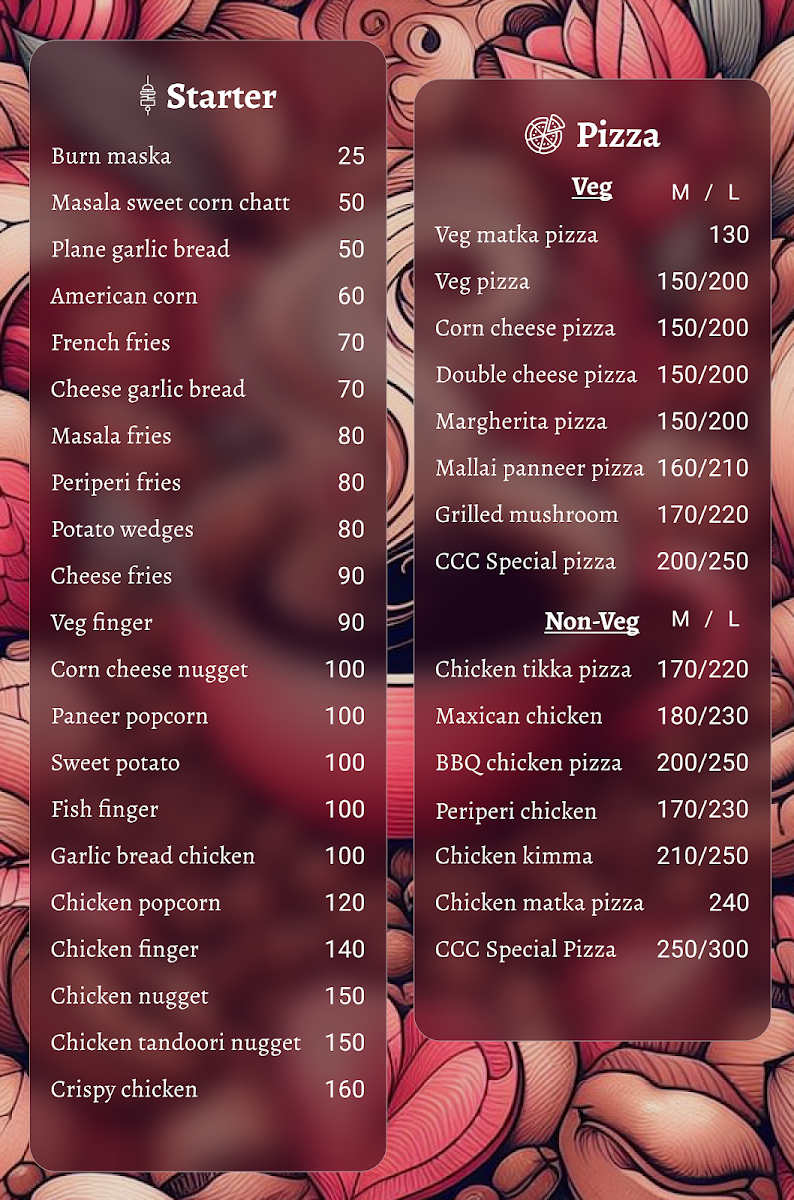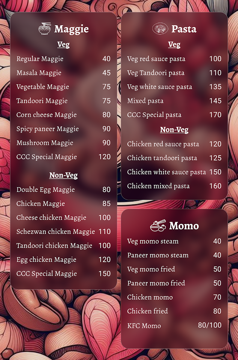 Care Couple Cafe invites you into a lively ambiance, where conversations flow as effortlessly as the coffee. Whether you are a coffee aficionado or just seeking a soothing cup to recharge, their menu won't disappoint. Indulge in a range of specialty coffees, from the classic Regular Coffee at just ₹15 to the decadent Caramel Coffee and Hot Chocolate Coffee for ₹20 each. Each cup is crafted to perfection, enveloping your senses in rich aromas and robust flavors.